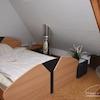 Schlafzimmer im Spitzboden mit Bett 140x210 cm, Nachttisch, Sessel, Tischchen, Korkboden.