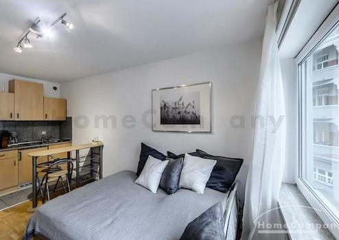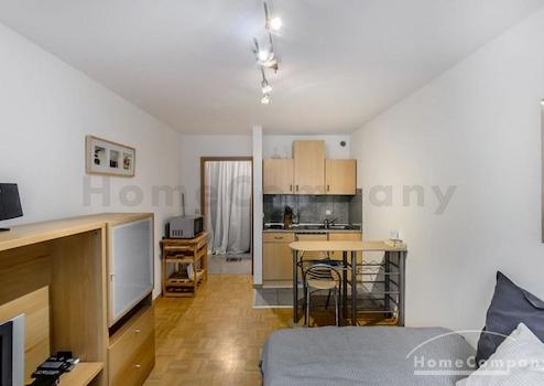 Hübsches möbliertes 1-Zimmer-Apartment in Schwabing, direkt am Englischen Garten. Kombinierter Wohn-/Schlafraum mit Französischem Bett und Kochnische mit Esstheke. Die Kochnische ist mit einer Mikrowellen-/Back-Kombination und mit allem, was man täglich braucht, ausgestattet. Das neue Bad ist mit Badewanne und Granit-Fußbodenheizung. Bodenbelag im Wohn-Schlafbereich: Parkettboden. Internetflatrate inklusive.