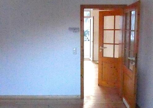 Böden: massive frisch abgeschliffene Weichholzdielen, neue Kieferntüren, die Decken und Wände sind mit Raufaser tapeziert und weiß gestrichen.