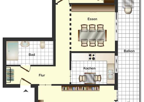 Der Wohnbereich mit Austritt zum XXL-Balkon bildet das Herzstück der Wohnung – hier entspannen Sie auf dem sichtgeschützten Balkon.