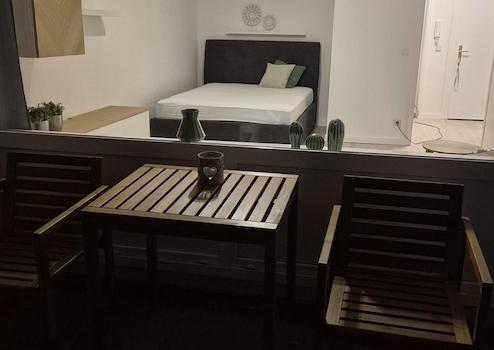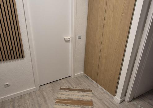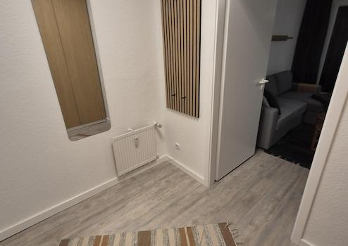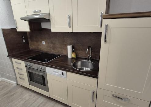 Eigener Treppenaufgang zur Wohnung, möbelierte Wohnung mit Schlafniesche, geräumiger Flurschrank, renoviertes Bad mit Glasdusche (fensterlos), Panoramafester (3-fach Verglasung), Küche nit Backofen, 4-Plattenkochfeld, Geschirrspüler, Kühlschrank mit Gefrierfach, Dunstabzug, Waschmaschienenanschluss, Trockenraum,