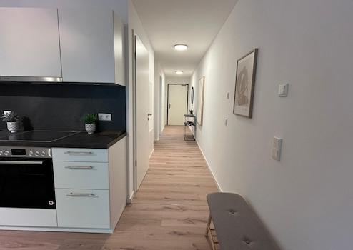 Eine exklusive Einbauküche mit modernen Großgeräten ist im Mietpreis bereits enthalten. Der Designvinylboden in Holzoptik verleiht den Räumen eine warme Atmosphäre und ist gleichzeitig pflegeleicht und langlebig. Im Badezimmer schaffen elegante Designfliesen im Format 60x60 cm ein modernes und stilvolles Ambiente. Für Sicherheit und Komfort sorgt eine Videogegensprechanlage. Elektrische Rollläden ermöglichen eine einfache Lichtregulierung, während die Fußbodenheizung in allen Räumen für behagliche Wärme sorgt.