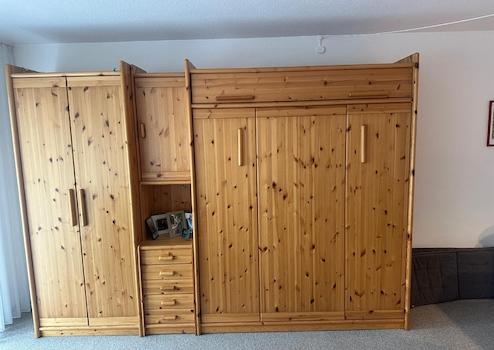 Flur mit Garderobe, Schlafzimmer mit 2 Einzelbetten, Bad mit Dusche, wandhängendem WC, Handtuchheizkörper, Waschmaschinenanschluss und Einbauschrank, Wohn-, Ess und Schlafzimmer mit offener Pantryküche und Schrankdoppelbett, große Loggia in S/O-Lage, Kellerraum.