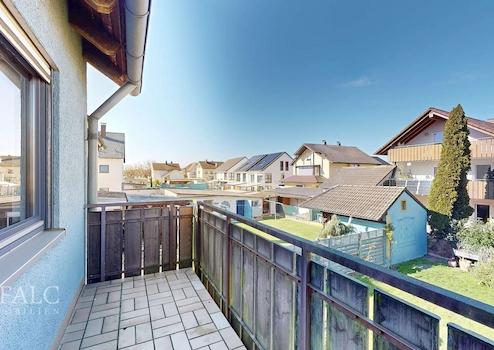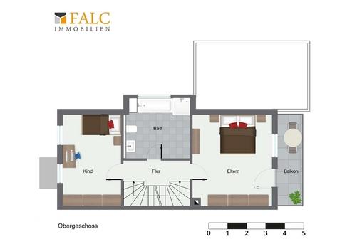 Im Obergeschoss finden Sie zwei geräumige Schlafzimmer, die durch ihre Holzböden Wärme und Gemütlichkeit ausstrahlen. Das Hauptschlafzimmer verfügt über einen Zugang zum Balkon, der einen Blick in den gepflegten Garten bietet. Das Badezimmer ist funktional gestaltet und mit einer Badewanne sowie einer separaten Dusche ausgestattet.