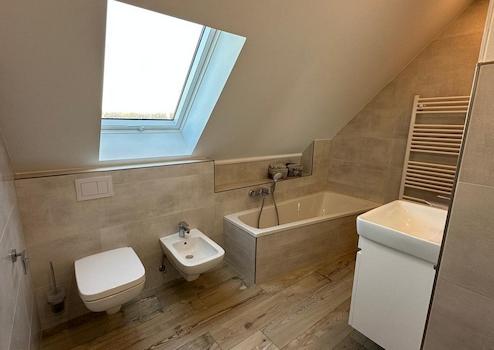 - ebenerdige Dusche mit Duschrinne, Bidet und Badewanne