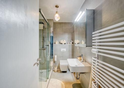 + Badezimmer: Das Bad ist mit einer großen, modernen Dusche ausgestattet und bietet viel Platz für erholsame Momente. Die hochwertigen Sanitärelemente von Villeroy & Boch unterstreichen das elegante und zeitlose Design.