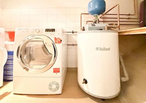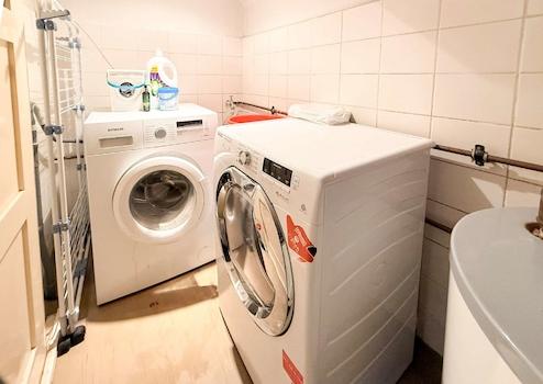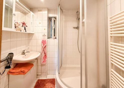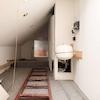 Das Erdgeschoss bietet ein besonders flexibles Nutzungspotenzial. Neben einem Badezimmer mit Badewanne, WC und Waschbecken befindet sich hier ein Hauswirtschaftsraum mit Anschlüssen für Waschmaschine und Trockner sowie der Warmwasseraufbereitung und weiterem Stauraum.