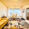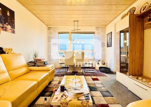 Das großzügig geschnittenen Wohnzimmer mit großer Fensterfront verfügt über einen direkten Zugang zum überdachten Sonnenbalkon mit herrlichem Panoramablick.