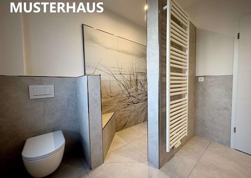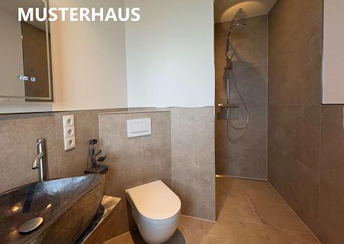 Die Beheizung erfolgt über eine moderne Luft-Wasser-Wärmepumpe in Verbindung mit Fußbodenheizung in allen Wohnräumen und gewährleistet energieeffizientes sowie behagliches Wohnen. Hochwertige Sanitärobjekte sind in allen Bereichen vorgesehen. Die Bodenbeläge werden mit großformatigen Fliesen (60 × 60 cm) ausgeführt, die Wandflächen in den Sanitärbereichen mit Wandfliesen im Format 60 × 30 cm.