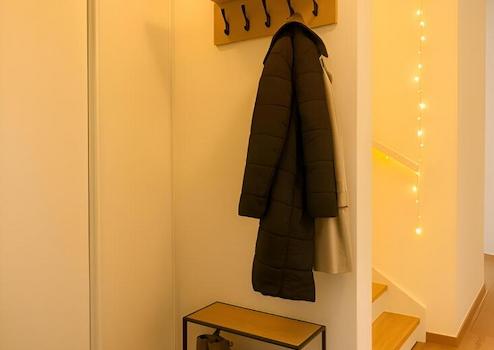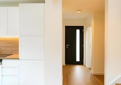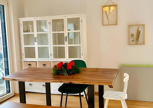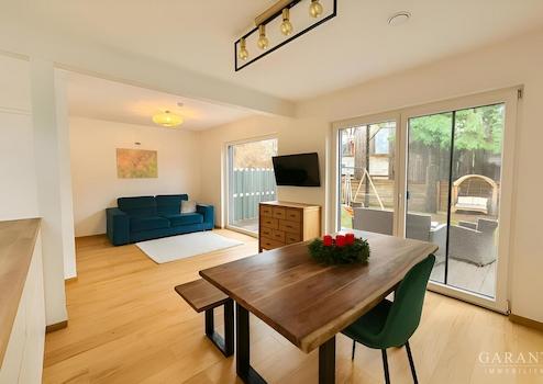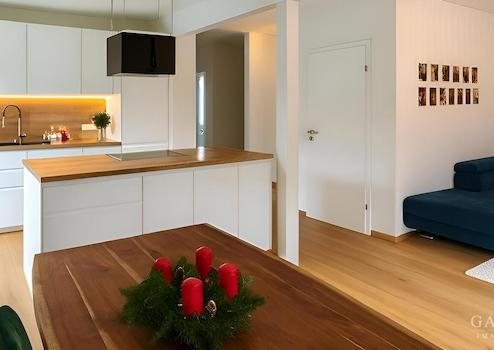 Schon beim Betreten der nicht unterkellerten Doppelhaushälfte in Holzständerbauweise (Fa. Regnauer) überzeugt das durchdachte Konzept: Ein kombinierter Heizungs-/Hauswirtschaftsraum, ein in weiß gehaltenes Gäste-WC und eine großzügige Garderobe sind mit anthrazitfarbenem Feinsteinzeug gefliest, das leicht gereinigt werden kann. Der lichtdurchflutete Wohn-/Essbereich mit offener Küche ist dagegen mit hochwertigem Buchen-Parkett ausgelegt. Ein praktischer abgeschlossener Abstellraum bzw. Speisekammer unter der Treppe ist ebenfalls vorhanden. Die bodentiefen Alu-Fenster an West- und Nordseite bieten einen schönen Blick auf die einladende Holz-Terrasse und in den umlaufenden Garten.