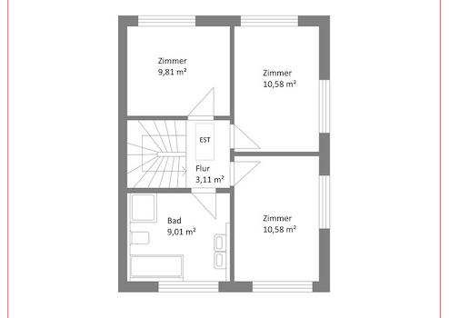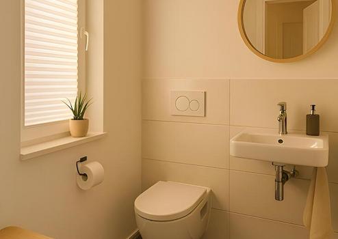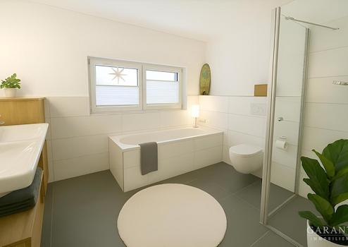 Über die mit Buchenholz belegte Treppe gelangen Sie ins Obergeschoss, das dank Pultdach kaum Schrägen hat und gute Stellmöglichkeiten aufweist. Drei ähnlich große Zimmer, zwei davon mit überhohen Decken, bieten unterschiedliche Nutzungsmöglichkeiten. Das in weiß gehaltene Badezimmer mit Doppelwaschbecken, Dusche und Wanne passt perfekt zum Design-Anspruch dieses besonderen Hauses. Marken-Sanitärobjekte und nicht alltägliche Strukturfliesen sorgen für den edlen Look Ihrer ganz privaten Wellness-Oase.