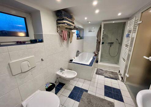 Gegenüber liegt das Badezimmer, ausgestattet mit Badewanne und Dusche. Am Ende des Flures befindet sich das Schlafzimmer; zusätzlich gibt es hier einen abgetrennten Bereich, der sich perfekt als Ankleide nutzen lässt.