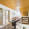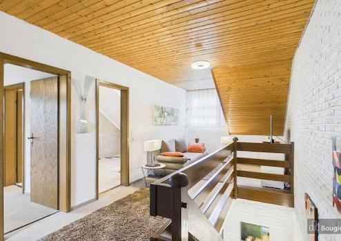 Die offene Galerie im Obergeschoss bietet sich ideal als Home-Office-Bereich an. Das geräumige Elternschlafzimmer mit Zugang zum seitlichen Balkon, ein weiteres Zimmer, das als Kinder-, Arbeits- oder Gästezimmer genutzt werden kann, sowie das moderne Badezimmer mit bodengleicher Dusche schaffen eine komfortable Wohnatmosphäre.