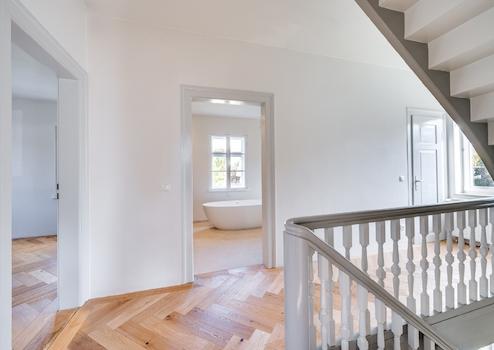 Schon beim Betreten spürt man die besondere Atmosphäre: Hohe Decken, edles Fischgrät-Parkett und sorgfältig aufbereitete originale Treppen und Fenster verleihen dem Haus eine herrschaftliche Ausstrahlung.
