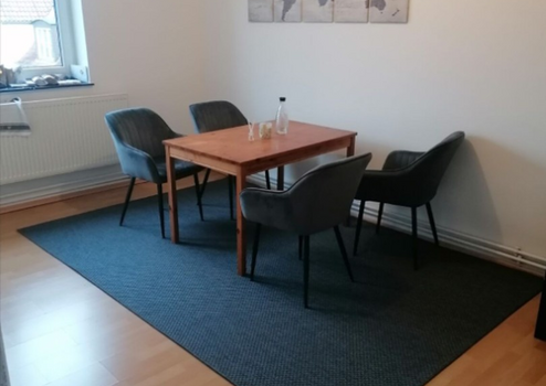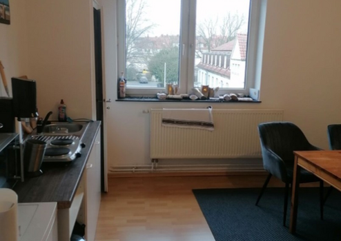 Die großzügige Wohnküche bietet ausreichend Platz für eine Essecke und lädt zu gemeinsamen Mahlzeiten ein. Das Wohn-/Schlafzimmer ist durch eine Wand praktisch unterteilt: Hinter der Wand lässt sich das Bett platzieren, sodass Wohnen und Schlafen räumlich voneinander getrennt sind.