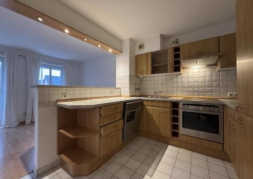 Das ruhig gelegene Schlafzimmer bietet ideale Voraussetzungen für eine komfortable Möblierung. Die gepflegte Einbauküche ist im Kaufpreis enthalten.