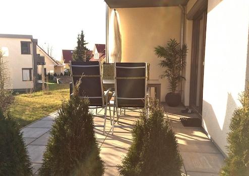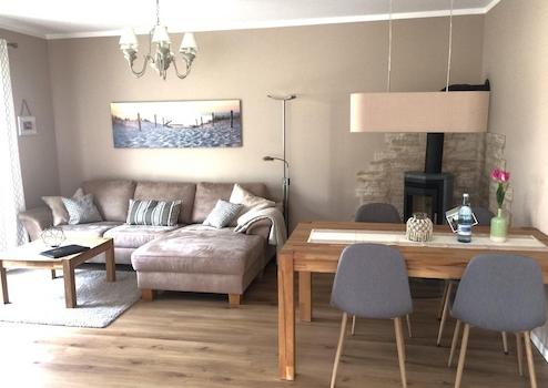 Diese 73 Quadratmeter große Erdgeschosswohnung bietet Ihnen ein Zuhause fernab des Alltagsstresses. Der offene Wohnbereich, der die modern ausgestattete Küche mit dem gemütlichen Wohnzimmer verbindet, lädt zum Verweilen ein. Hier finden Sie alle Annehmlichkeiten, die Sie in einer komplett eingerichteten Küche benötigen: ein Ceranfeld, einen Backofen, eine Spülmaschine, eine Waschmaschine, eine Mikrowelle, eine Kaffeemaschine, einen Toaster sowie einen Kühlschrank mit Gefrierfach. Eine separate Sitzecke bietet den idealen Ort für ein entspanntes Frühstück, während der Kaminofen im Wohnzimmer für wohlige Wärme und eine behagliche Atmosphäre sorgt. Vom stilvoll eingerichteten Wohnzimmer aus gelangen Sie direkt auf die großzügige Terrasse mit Zugang einer kleinen Rasenfläche.