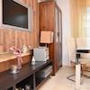 Schlafzimmer mit Bett 90x200 cm, Kleiderschrank, offener Kleiderschrank, smart TV.