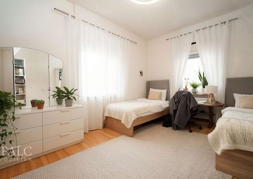 Ein weiteres helles Zimmer lässt sich flexibel als Kinder-, Gäste-, Arbeits- oder Hobbyraum nutzen, ganz nach Ihren Vorstellungen und Ihrem Bedarf. Durch westliche Ausrichtung des Fensters genießen Sie hier herrliche Sonnenuntergänge am Abend.