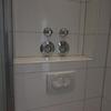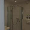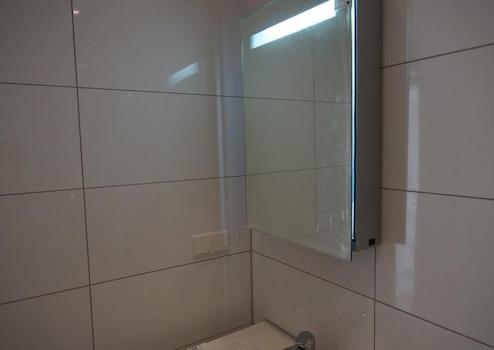 Modernes Badezimmer mit Dusche, Spiegelschrank, Unterschrank und Handtuchheizkörper