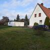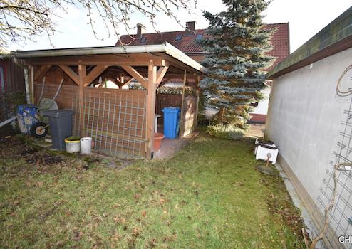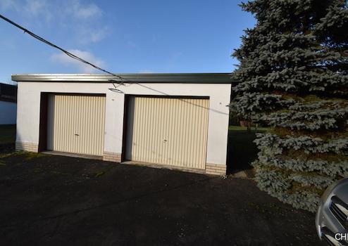 Gehen wir nun noch auf das gepflegte und ebenerdige Grundstück. Über die gepflasterte Hofeinfahrt gelangt man zu der Doppelgarage. 2017 wurde das alte Garagendach abgetragen und durch ein neues Dach aus Trapetzblech eingedeckt.