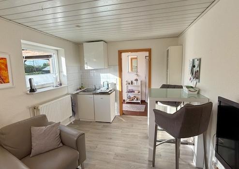 Der ehemalige Stallbereich im Erdgeschoss wurde mit zwei Räumen, einer davon mit Pantry-Küche, Flur und Tageslichtbad zu Wohnzwecken ausgebaut. Zusätzlich gibt es noch eine integrierte Garage mit Abstellfläche und eine überdachte Terrasse.