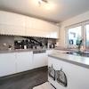 Die offene, moderne Einbauküche bietet reichlich Stauraum dank glänzend weißer Fronten und durchgängiger Ober- und Unterschränke. Die Arbeitsflächen in Betonoptik verleihen dem Raum eine klare, zeitgemäße Ästhetik. Hochwertige Elektrogeräte, ein großer Fensterbereich mit viel Tageslicht sowie ein stilvoller Spritzschutz mit Skyline-Motiv schaffen eine elegante und funktionale Kochumgebung.