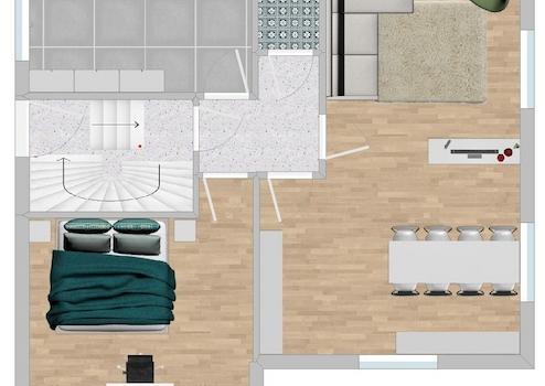 - - DG: Wohnzimmer, 2 Schlafzimmer, Küche, WC