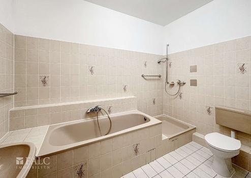 Auch das Badezimmer fügt sich harmonisch in das Gesamtbild ein. Es ist ausgestattet mit Dusche mit einer neuen Glasabtrennung, Badewanne, WC und Waschtisch und verfügt zudem über eine praktische Stellfläche für einen Trockner. Funktionalität trifft hier auf Komfort.
