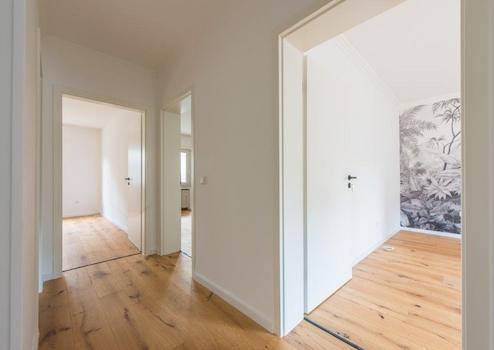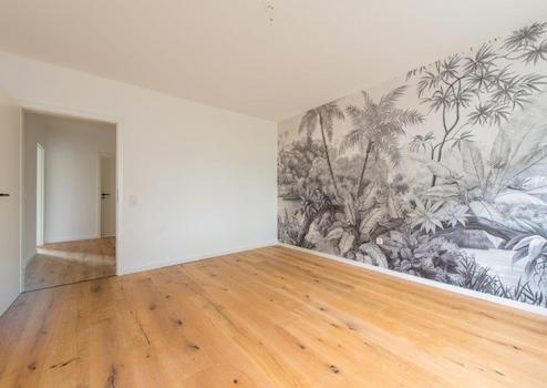 Ihr zukünftiges Zuhause bietet ein neu verlegtes Echtholzparkett aus Eiche im Verlegtyp breite Landhausdiele. Die Wände der Wohnung sind allesamt frisch gespachtelt und gestrichen worden. Eine der vier Zimmerwände hat eine Dekortapete von coolen Hersteller "Fotowall" mit dem Muster "Taintet Jungle" (je Zimmer).