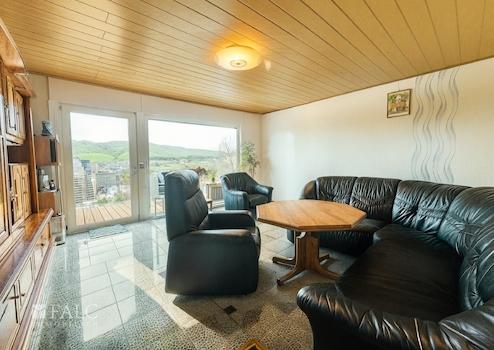 Von der Diele gelangen Sie in das helle Wohnzimmer mit großen Fensterfronten, die den Raum in warmes Tageslicht tauchen. Hier entsteht ein idealer Ort für entspannte Stunden mit der Familie. Der direkte Zugang zum großzügigen Balkon eröffnet einen herrlichen Blick in den liebevoll angelegten Garten.