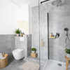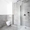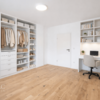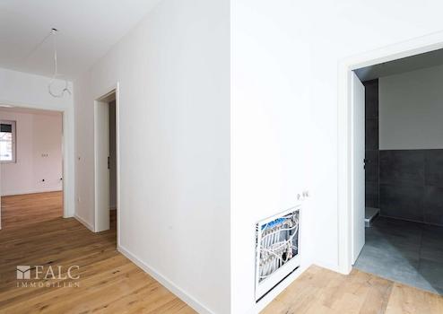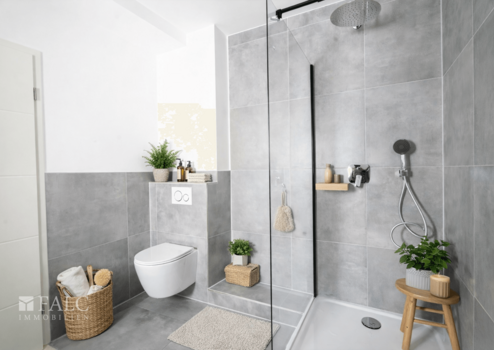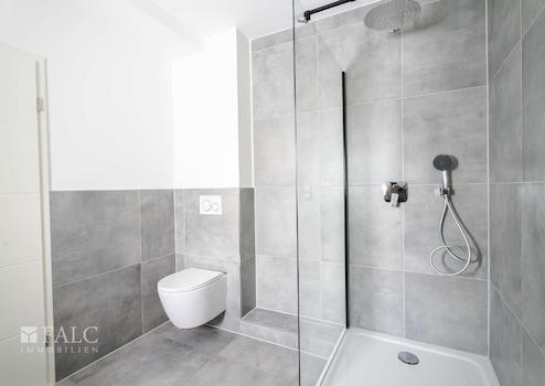 Das Badezimmer ist elegant ausgestattet mit großformatigen 60×60 cm Fliesen und einer bodentiefen Dusche, ergänzt durch hochwertige Materialien sowie eine durchdachte Lichtplanung mit LED-Spots. Der Waschmaschinenanschluss befindet sich ebenfalls im Badezimmer und sorgt so für zusätzlichen Wohnkomfort.
