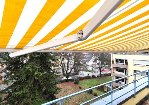 Die Terrasse ist ca. 20 qm gross und hat 2 Markisen.