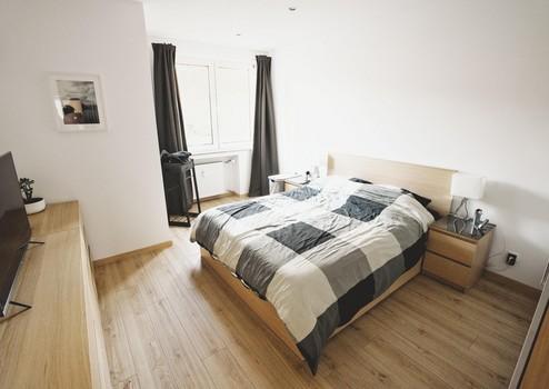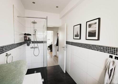 Die Wohnung ist mit hochwertigen Vinylböden ausgelegt. Im Küchenbereich und dem Badezimmer sind anthrazitfarbene Fliesen in 30 cm x 60 cm verlegt. Die Dusche ist eine moderne, bodentiefe Walk-In-Dusche.