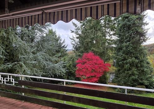 Das Grundstück (ca. 1200 qm) verfügt über einen sehr geschützten, nicht einsehbaren, Gartenbereich (am Hangfuß), während man vom Haus ( Wohn/Esszimmer, Dachwohnung) oben auf dem Hang einen weiten Blick in Garten und ins Tal genießen kann(Südseite).