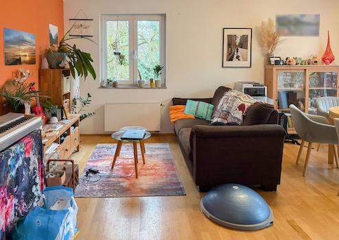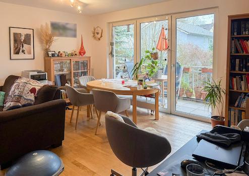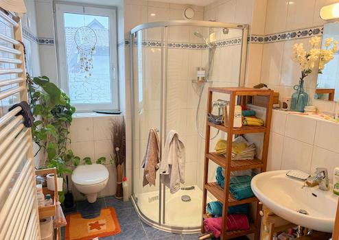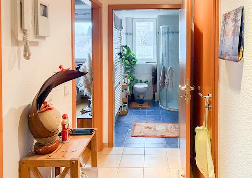 - Bodenbelag: Echtholzparkett aus massiver Eiche und Fliesen