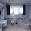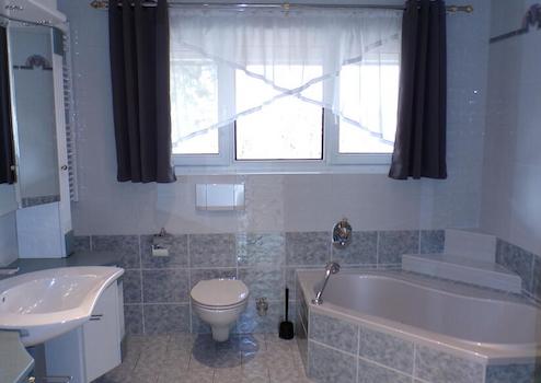 * Badezimmer im Erdgeschoss mit Eckbadewanne, Dusche und WC