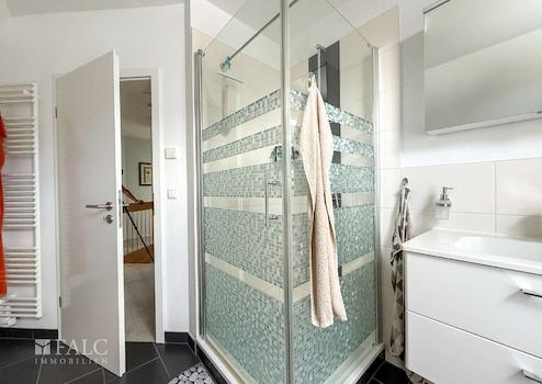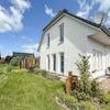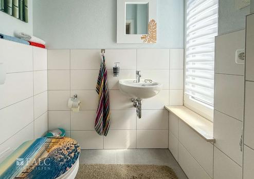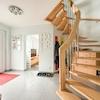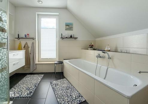 Die zweifach verglasten Kunststofffenster, teilweise bodentief, sowie der energetische Dämmstandard und ein Zertifikat zur luftdichten Gebäudehülle unterstreichen die gute Energieeffizienz. Das Badezimmer im Dachgeschoss verfügt über Wanne, Dusche und ein Fenster, während im Erdgeschoss ein Gäste-WC vorhanden ist. Eine Holztreppe verbindet das Erd- und Dachgeschoss.