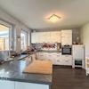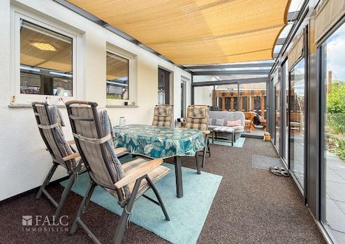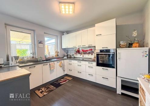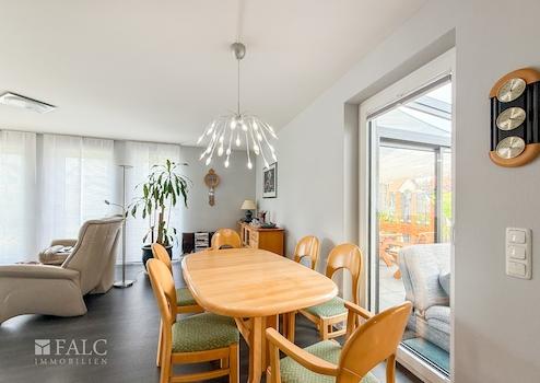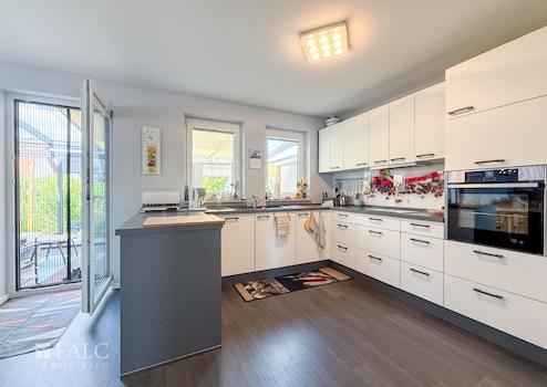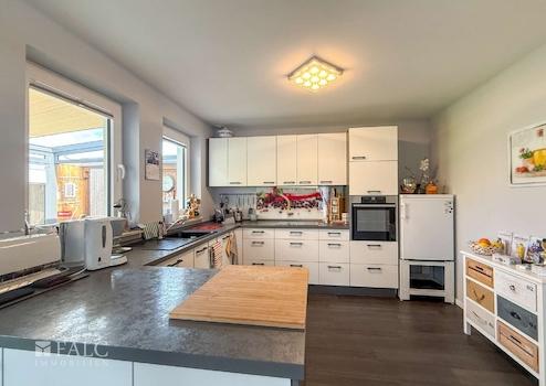 Der offene Wohn- und Essbereich empfängt mit großen Fensterfronten, die den Blick in die Natur öffnen und den Raum mit Sonne durchfluten. Von hier führt der Weg direkt hinaus in den einladenden Wintergarten – ein Platz, an dem man die Stunden des Tages in ganzer Ruhe genießen kann. Die moderne, hochwertig ausgestattete Küche fügt sich harmonisch in das stilvolle Gesamtbild ein und bildet das Herzstück gemeinsamer Momente.