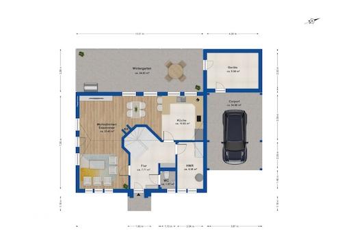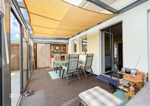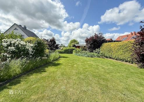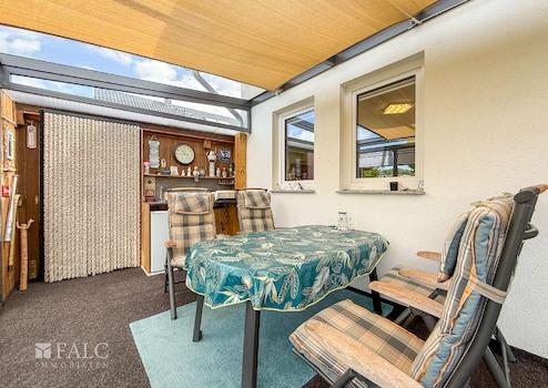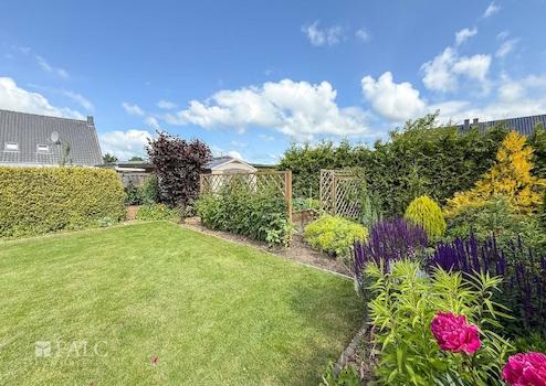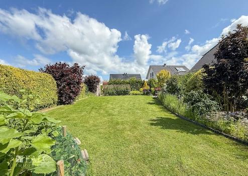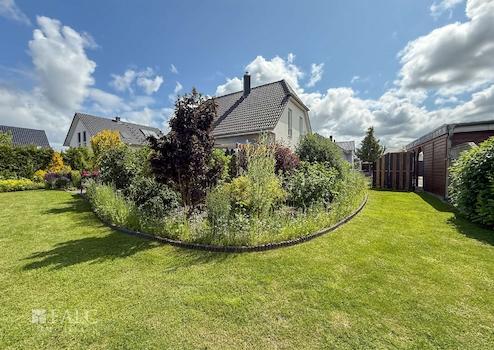 Der Außenbereich umfasst ein 655 m² großes, sehr gepflegtes und eingefriedetes Grundstück mit Wintergarten, Grillecke, einem Carport mit Schuppen, ein weitere Schuppen für Garten Utensilien und gepflasterten Stellplätzen. Die Terrasse ist nach Süd-West ausgerichtet. Technisch bietet das Haus Solar für Warmwasser, und eine Sat-Anlage.