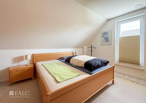 Das großzügige Hauptschlafzimmer öffnet den Blick weit ins Grüne und lädt dazu ein, jeden Morgen mit Ruhe und Gelassenheit zu beginnen.
