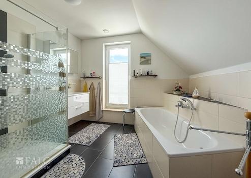 Zwei weitere helle Zimmer schenken Freiheit zur individuellen Gestaltung – ob als Kinderzimmer, Gästezimmer oder stilvolles Homeoffice. Das elegante Badezimmer, geprägt von hochwertigen Materialien, vereint Funktionalität und Ästhetik: eine komfortable Badewanne und eine großzügige Dusche machen den Raum zu einer kleinen Wohlfühloase.