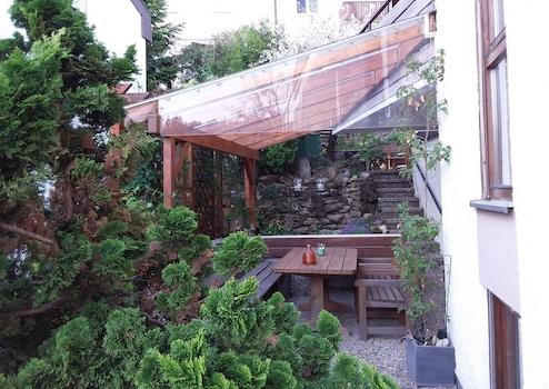 Die 12 Meter lange Garage bietet genügend Abstellfläche für Auto und Fahrräder. Davor befindet sich ein teilweise überdachter großer Kfz-Abstellplatz.