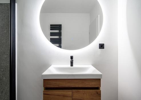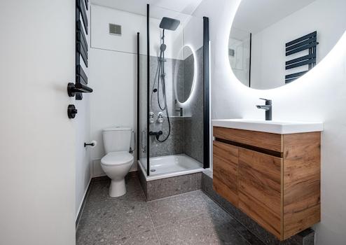• Badezimmer: Modernes Design mit Terrazzo-Fliesen, eigener Waschmaschinenanschluss, neue Dusche und WC, stylischer LED Spiegel und gegenüber der neue Handtuchheizer