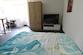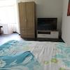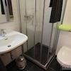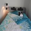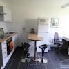 Heller Wohn-und Schlafraum mit Fernsehwand, Bistrotisch, Doppelbett, Schreibtisch. Genügend Stauraum durch einen Kleiderschrank. Pantryküche mit Spülmaschine, Kühl- und Gefrierkombination und Elektroherd. Badezimmer mit geräumiger Dusche.