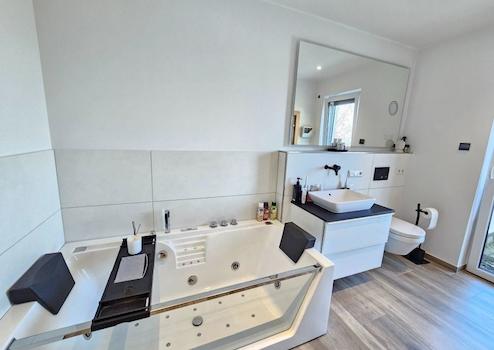 Im Obergeschoss erwarten Sie zwei Kinderzimmer, ein Büro, ein weiteres Tageslichtbad mit Dusche sowie das großzügige Elternschlafzimmer mit begehbarem Ankleidezimmer, eigenem Bad mit Whirlpool Wanne und Dusche, Sauna und Balkon.