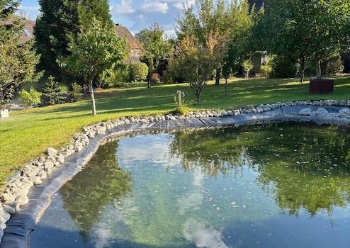 Im Garten ist ein Schwimmteich vorhanden, zudem gibt es eine große überdachte Terrasse.