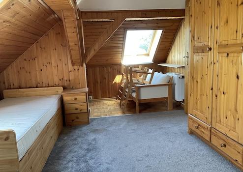 ausgebautes DG: Bad mit Dusche, Küche mit Pantry, Zimmer möbliert. Bad und Küche Fliesen, Zimmer Teppich und Laminat. Zimmer mit Verdunkelungsrollos