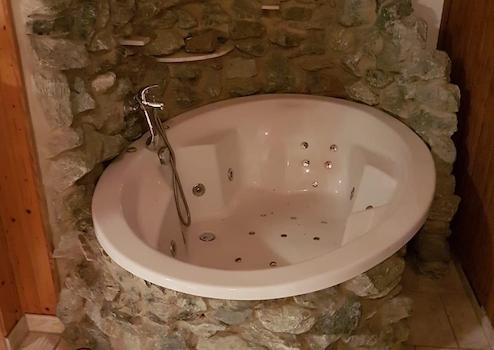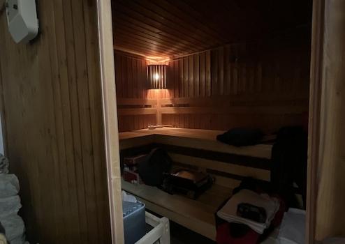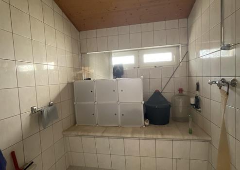 Sauna/-Gästehaus: vermietet, kleine Küche, WC mit Waschbecken, Duschraum mit großer Sitzbank, Sauna, Whirlpool. Böden gefliest