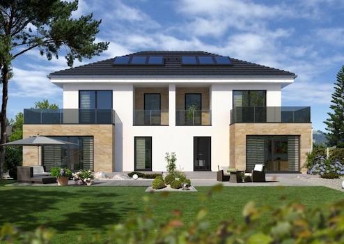 Die klassisch elegante Doppelhaushälfte wird von einem Walmdach geprägt. Das Haus bietet einen guten Wohnkomfort für eine vierköpfige Familie (aufgrund der Bauform müssen beide Haushälften gleichzeitig gebaut werden). Im Erdgeschoss ist ein Zusatzraum geplant, der als Büro/Gäste- oder Hobbyraum genutzt werden kann. Optional ist auch ein Bad mit Dusche im Erdgeschoss möglich, somit wäre bei Krankheit oder im Alter auch das Wohnen auf einer Etage möglich. Der Wohn-/Ess-/Kochbereich ist mit vier großen Terrassentüren ausgestattet und bietet auf 39 m² bzw. 37 m² viel Platz für die Familie. Die geradläufige Treppe strahlt Struktur und Modernität aus.